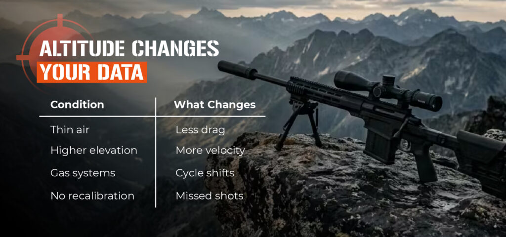 - High altitude: recalibrate point of impact, adjust gas regulator if applicable, update ballistic app with local data.