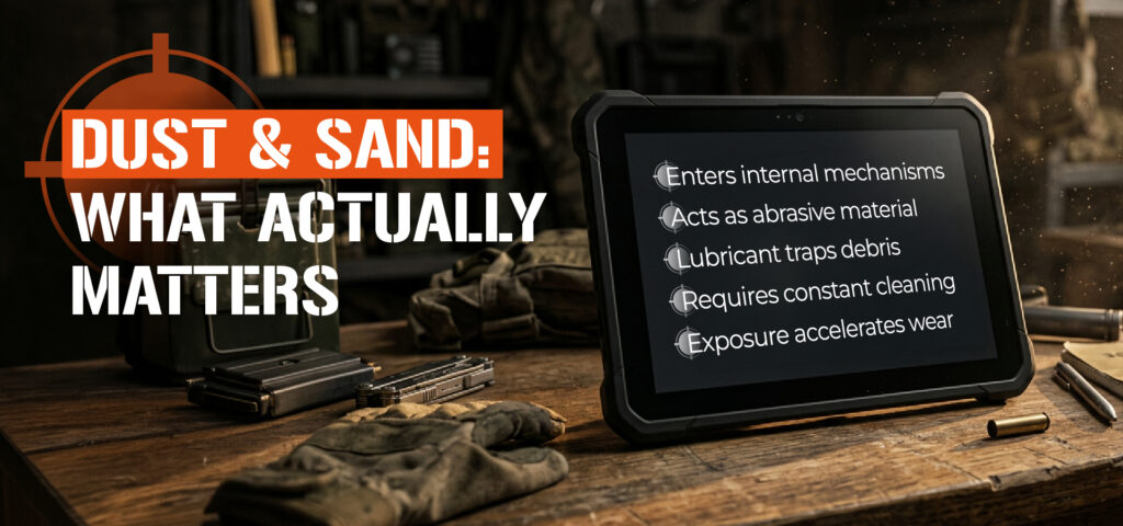 The solution is not more lubricant, it’s the opposite. In dusty environments, excess lubricant acts as a magnet for particulates, creating an abrasive paste that actively damages the mechanism. The key is minimal lubrication with products formulated for arid conditions, keeping the firearm covered when not in active use, and cleaning it before shooting, not just after.